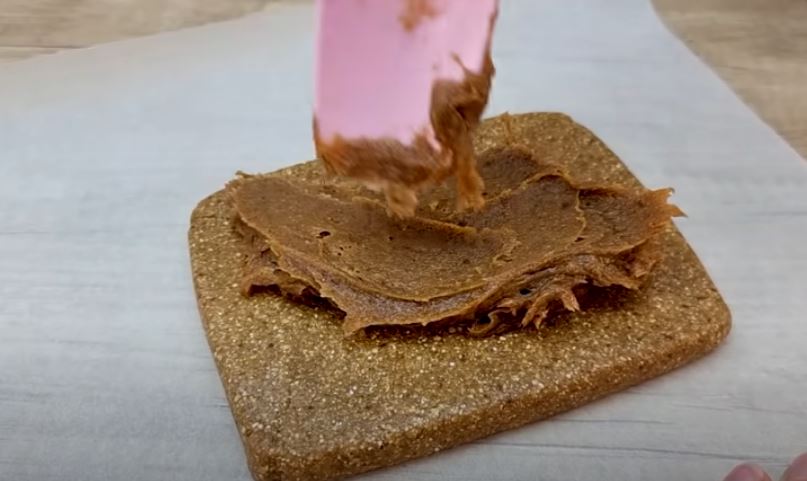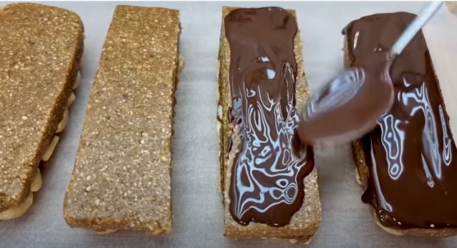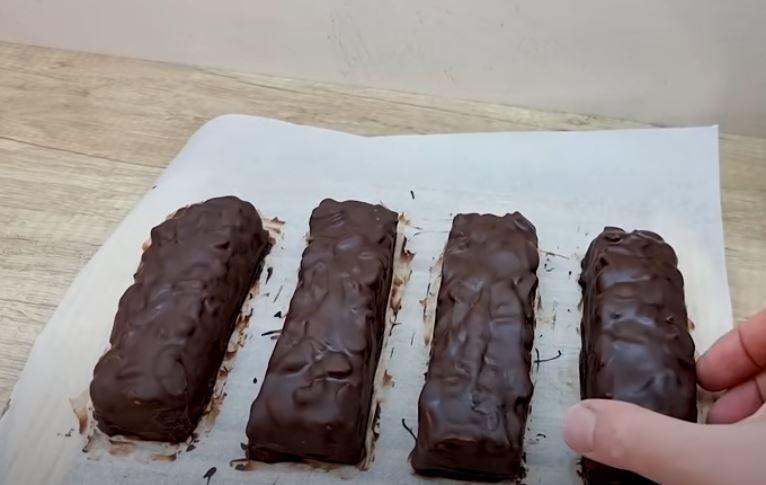 Βάλαμε στο ψυγείο για 30 με 40 λεπτά, Στο χρόνο αυτό λιώσαμε τη σοκολάτα στο φούρνο μικροκυμάτων. Το βγάλαμε από το ψυγείο και το κόψαμε σε τέσσερις μπάρες.