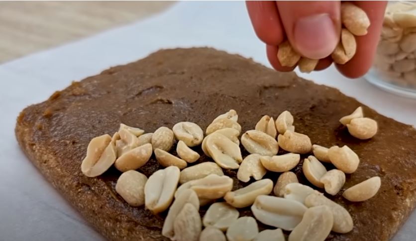 Στη συνέχεια ρίξτε τους χουρμάδες στο μπλέντερ μαζί με δύο κουταλιές της σούπας φυστικοβούτυρο λίγο αλάτι διπλοχτυπήσαμε πολύ καλά να γίνει κρέμα. Μετά βγάλε με λίγο από το μίγμα σε ένα μικρό μπολάκι 40% βγαζουμε και 60% αφήνουμε στο μπλεντερ.