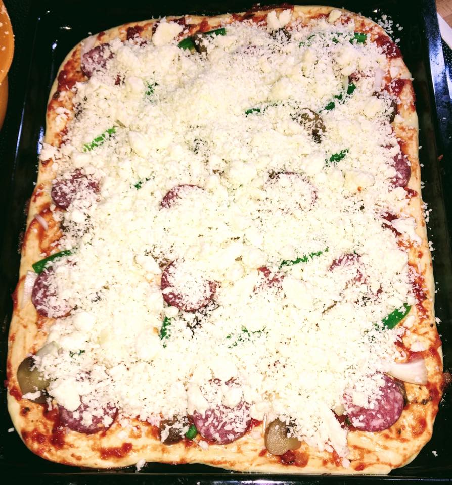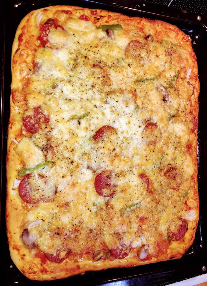 Βραδιά πίτσας απόψε! Φανταστική ζύμη για μια πεντανόστιμη πίτσα με πράσινη πιπεριά, κρεμμύδι, μανιτάρια, σαλάμι pepper και μοτσαρέλα!