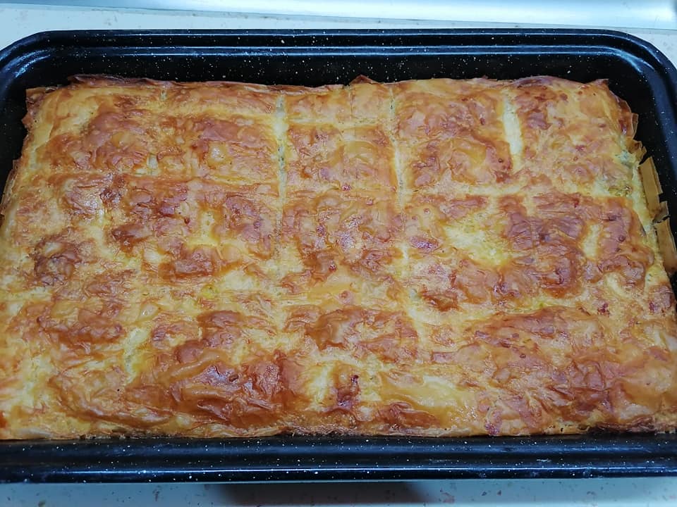 Ρίχνουμε τη γέμιση και ξανά τα υπόλοιπα φύλλα με τον ίδιο τρόπο και λαδώνουμε το τελευταίο φύλλο και ραντίζουμε με γάλα.