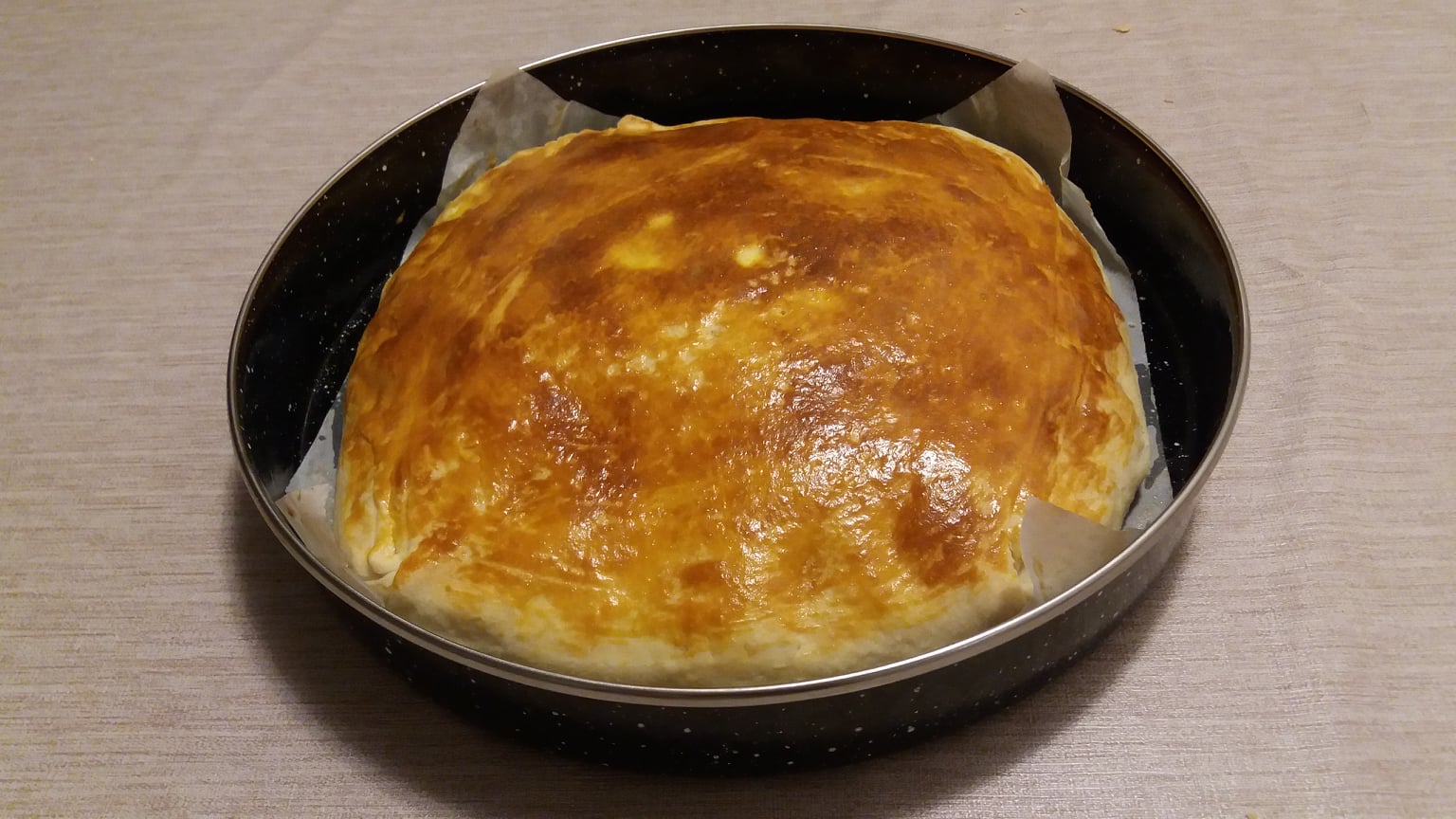 5. Ανάβουμε το φούρνο να ζεσταθεί στους 200 βαθμούς. Στη συνέχεια απλώστε την κρούστα με τα δάχτυλά σας στο μέγεθος ενός ταψιού. Περιχύνουμε την πίτα με χτυπημένο κρόκο αυγού και ψήνουμε μέχρι να ροδίσει.