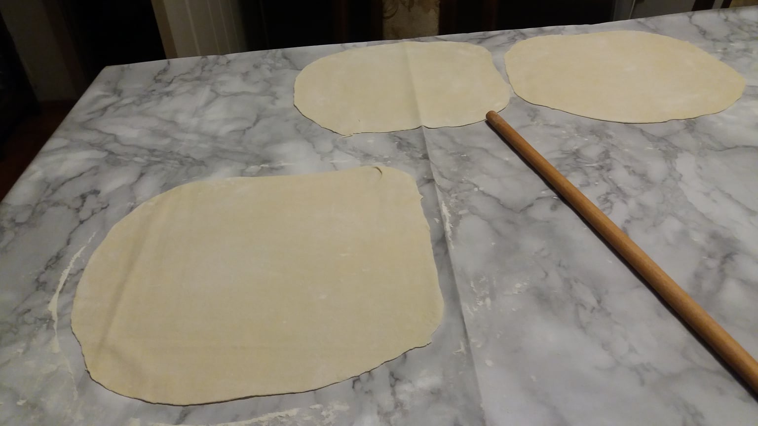 Στη συνέχεια, ανοιξτε και τα τρία ζυμαρικά με έναν πλάστη σε όσο το δυνατόν λεπτότερο κύκλο, πάχους περίπου 2 mm.