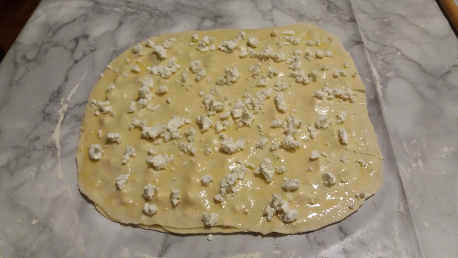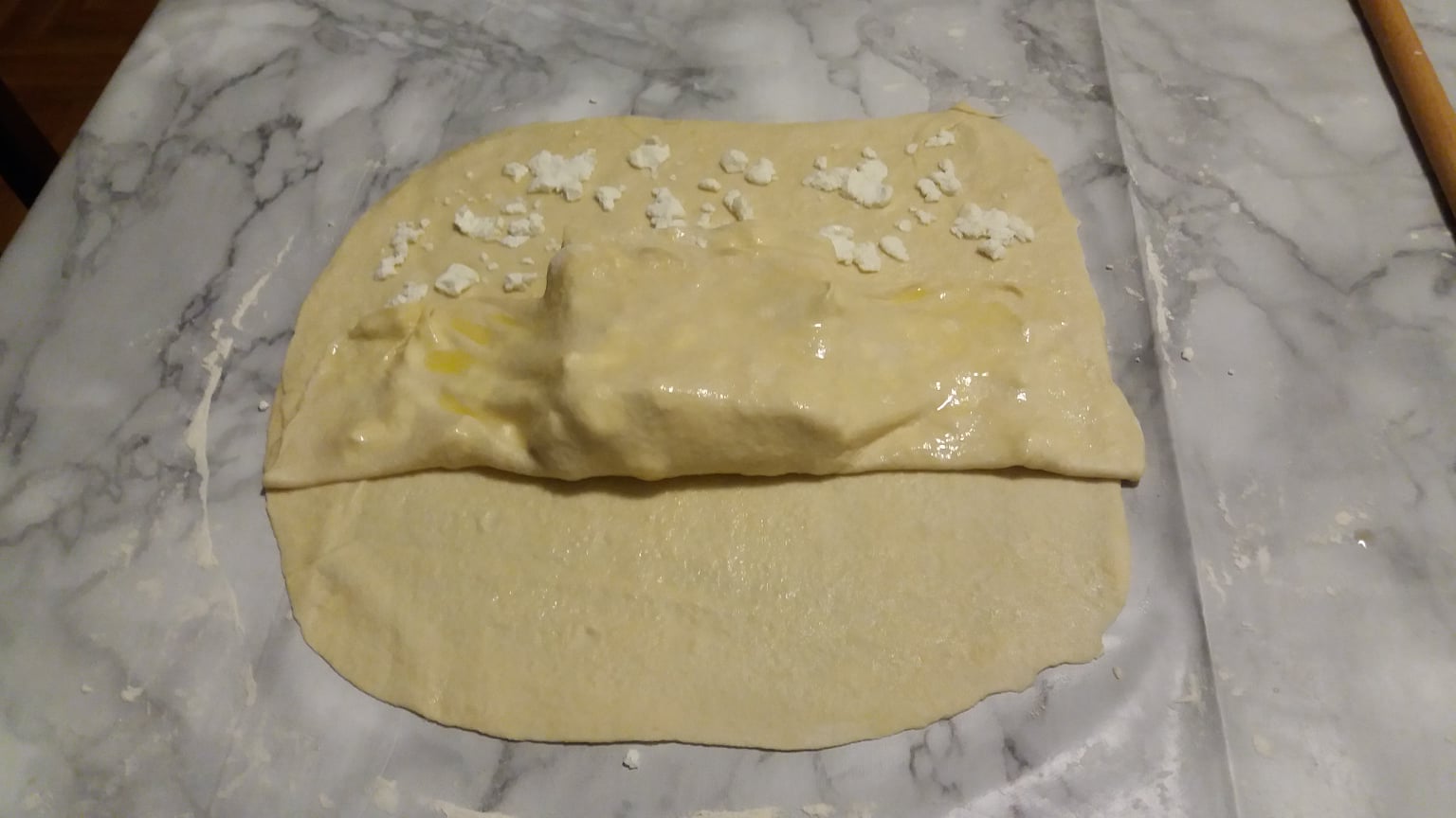 Τώρα διπλώνουμε το πίσω φύλλο σε σχήμα φακέλου και το αλείφουμε κάθε φορά που διπλώνει (διπλώνουμε τη ζύμη στη μέση – τη λαδώνουμε – μεταφέρουμε την αντίθετη πλευρά πάνω από τη διπλωμένη – τη λαδώνουμε – διπλώνουμε την αριστερή