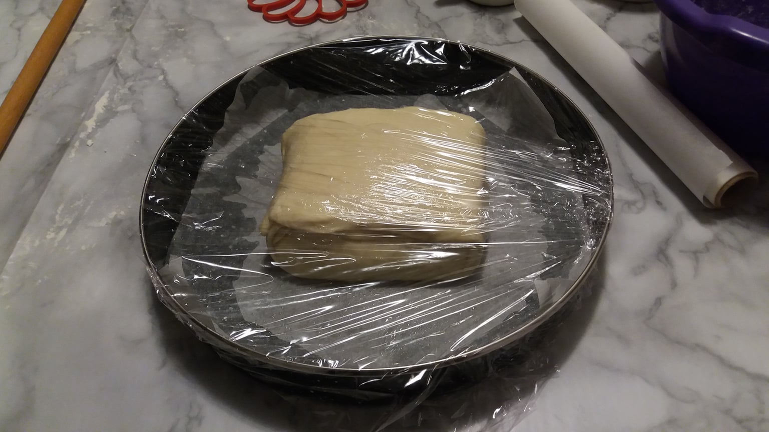 Επαναλάβετε την ίδια διαδικασία με το πίσω φύλλο. Μεταφέρουμε τη ζύμη στο έτοιμο ταψί και το λαδώνουμε από όλες τις πλευρές. Σκεπάζουμε τη ζύμη με μεμβράνη και την αφήνουμε για 15 λεπτά.