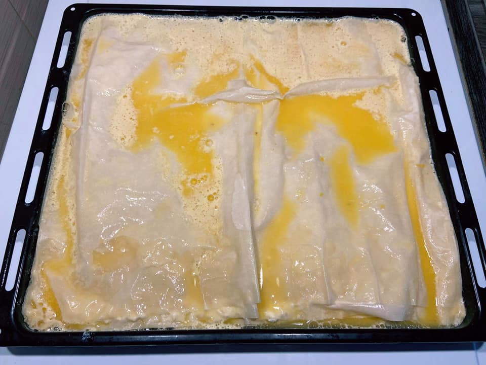 Χαράζουμε την πίτα και χτυπάμε τα αυγά για την γέμιση σε ξεχωριστό μπολ και προσθέτουμε σταδιακά το ανθρακούχο νερό. Ρίχνω το μείγμα που λαμβάνεται με αυτόν τον τρόπο στα φύλλα, φροντίζοντας να εχουν εμποτιστεί καλα, έτσι ώστε οι άκρες