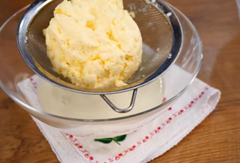 Σουρώνουμε το μείγμα σε ένα μπολ με παγωμένο νερό για να απομακρυνθεί ο ορός γάλακτος.