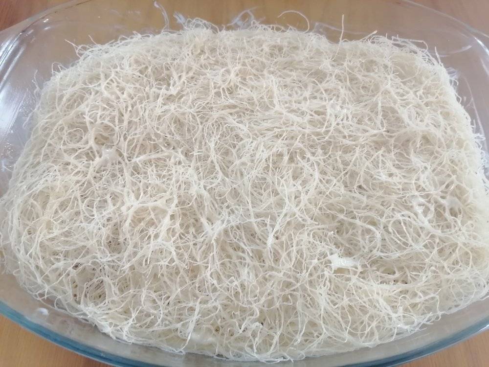 - Πρωτο βημα ειναι να αφρατεψετε το κανταιφι. το κανετε αυτο με τα χερια σας για να ανοιξει καλα.