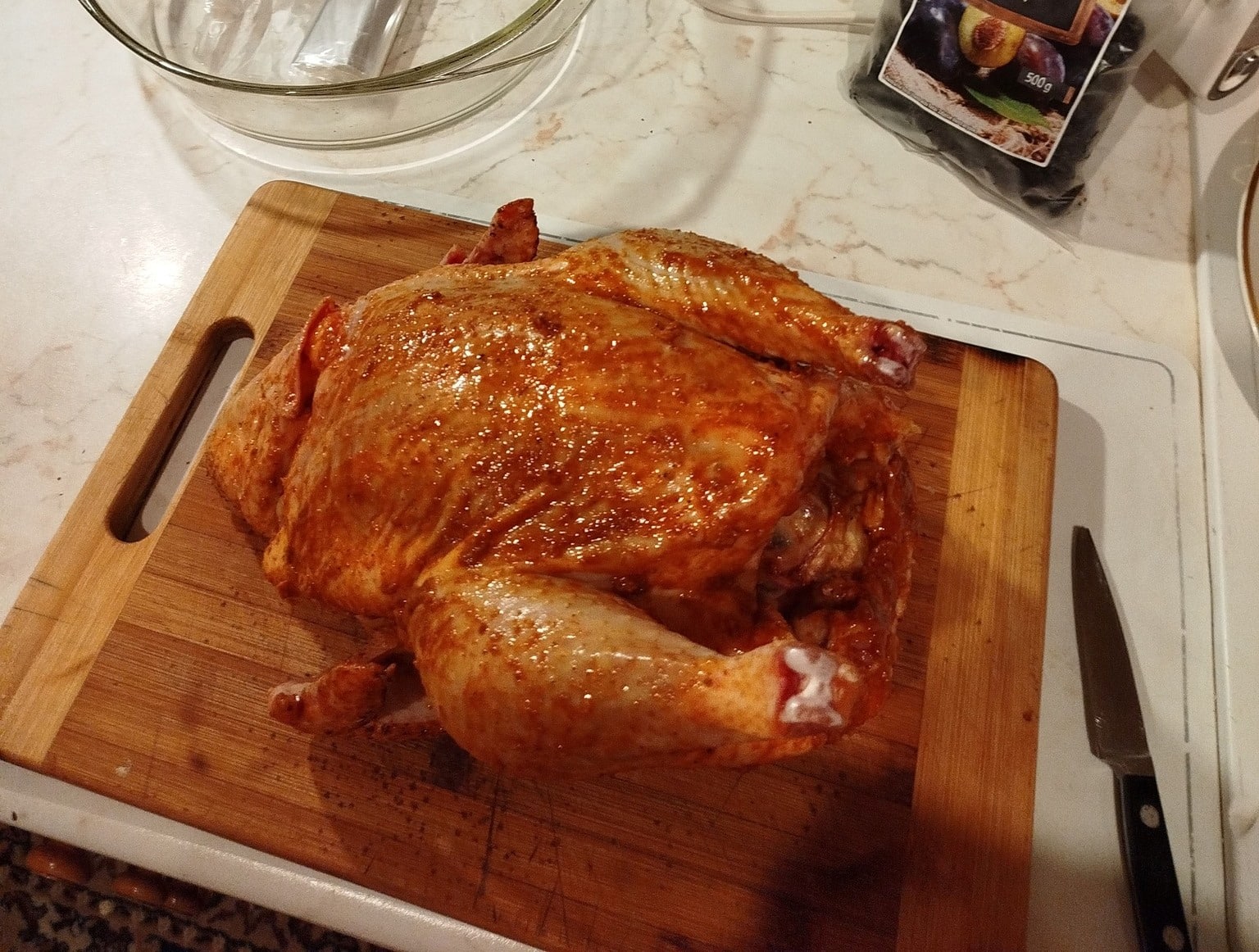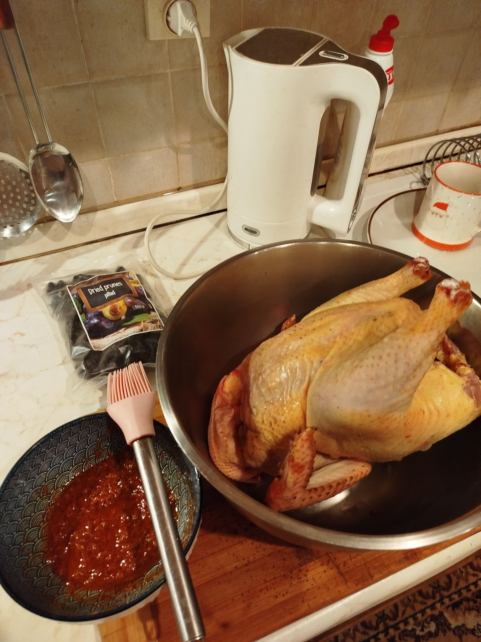 Αλείφουμε καλά το κοτόπουλο τόσο εξωτερικά όσο και εσωτερικά με το μείγμα μαρινάδας.