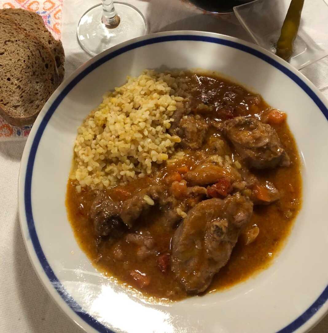 Σπιτικό κουνέλι στιφάδο με γαρνιτούρα πλιγούρι.