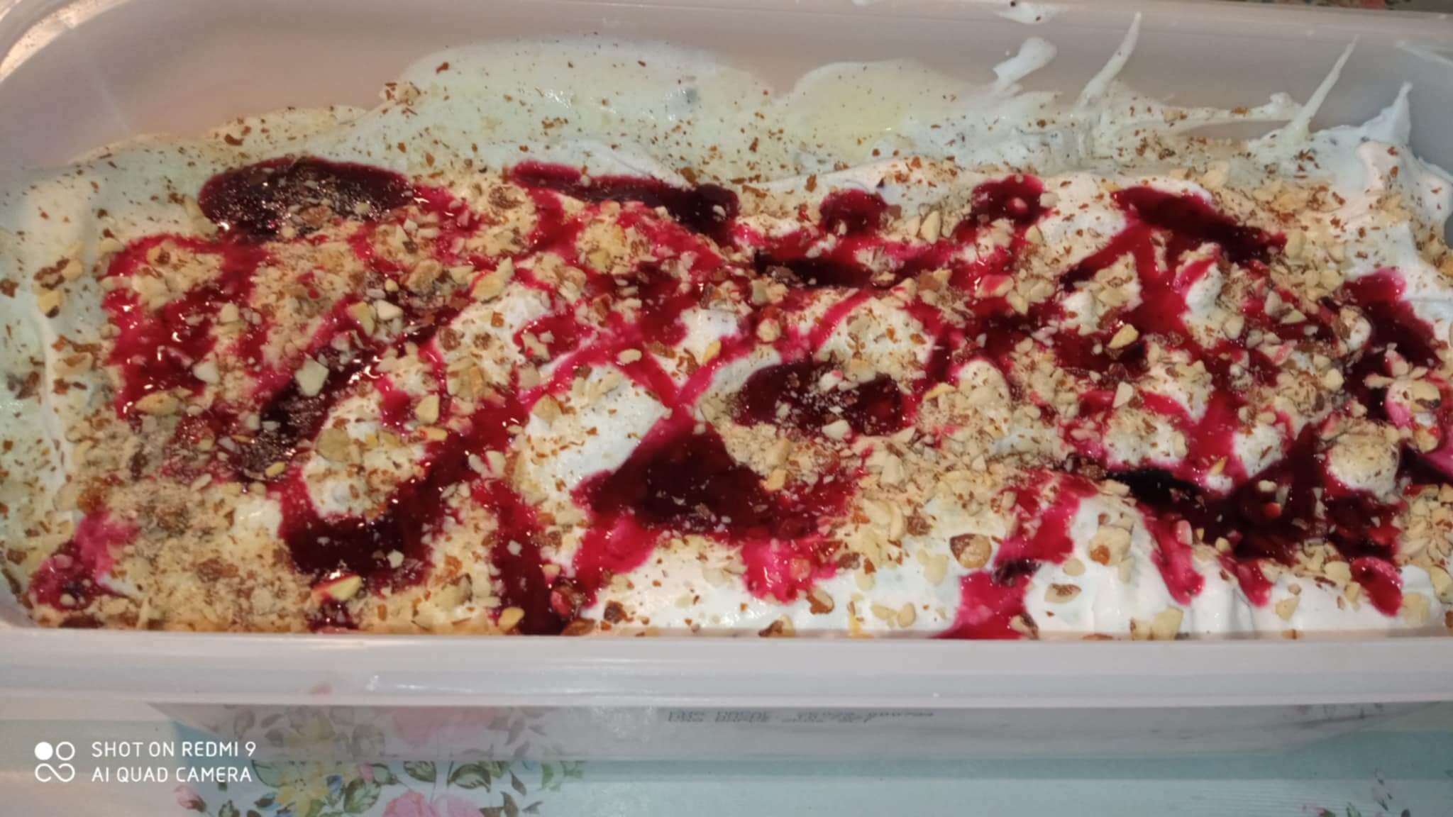 Βάζουμε το παγωτό στην κατάψυξη για 4-6 ώρες, μέχρι να παγώσει καλά.