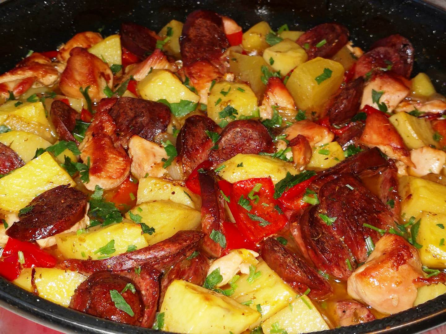 Σπιτικό πιάτο με κομμάτια κοτόπουλου, λουκάνικο, λαχανικά