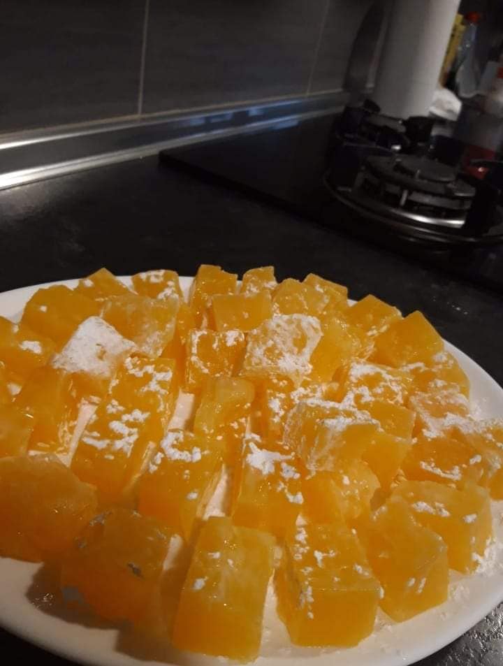 Παίρνουμε ένα γυάλινο σκυος που το και ρίχνουμε τη σύνθεση μας. Αφήστε να κρυώσει σε θερμοκρασία δωματίου. Αφού κρυώσει το κόβουμε σε τετράγωνα.