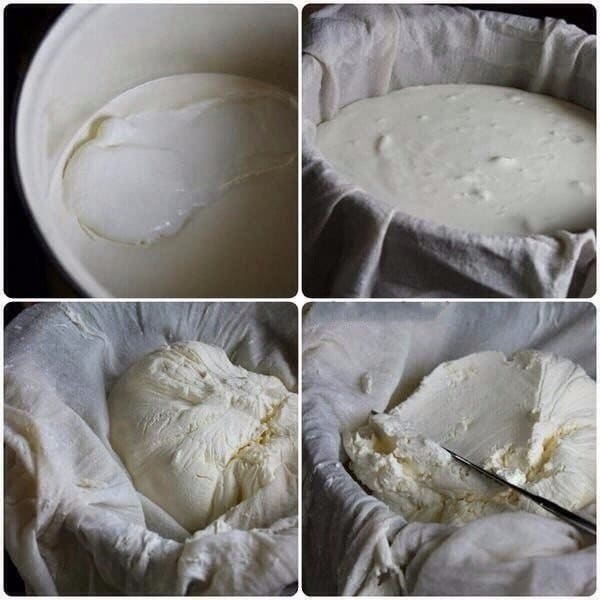 Αδειάζουμε το μείγμα σε ένα σουρωτήρι που έχουμε καλύψει με καθαρό τουλουπάνι. Δένουμε το τυρί και το κρεμάμε πάνω από τον νεροχύτη για 15 λεπτά ώστε να στραγγίξει καλά ο ορός και να μείνει το τυρί