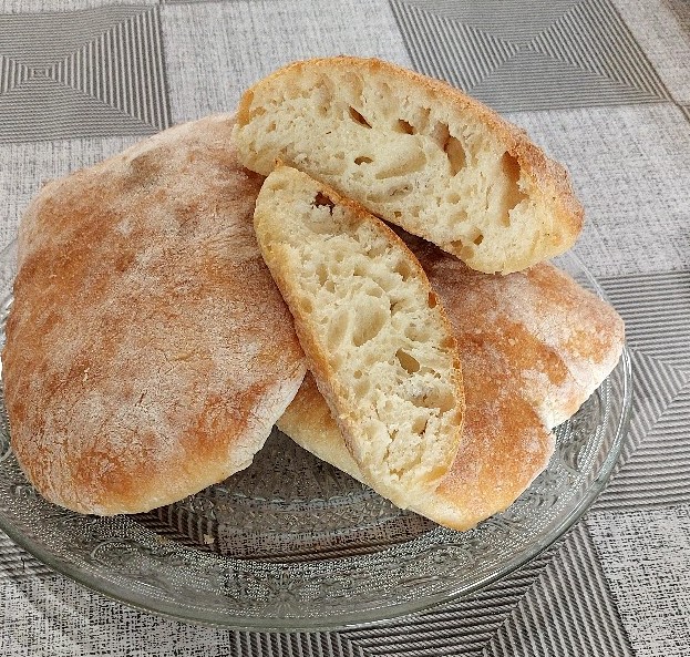 Είναι νόστιμο ψωμί, με τραγανή κρούστα εξωτερικά, μαλακή ψίχα εσωτερικά που έχει μεγάλες τρύπες, σα το ελβετικό τυρί. Απλά το αγαπάμε. Η ονομασία του στα ιταλικά σημαίνει “παντόφλα”, εξαιτίας του σχήματος της