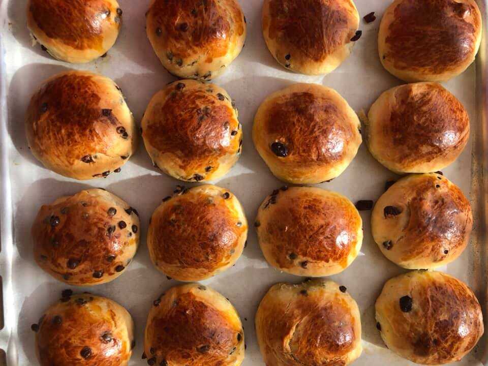 Προσθέτουμε την σοκολάτα ή την σταφίδα, ζυμώνουμε 5 λεπτά. Πλάθουμε μπαλάκια των 100γρ, βγαίνουν 20 και αφήνουμε να φουσκώσουν για μισή ώρα. Αλείφουμε με 1 κρόκο ανακατεμένο με 1 κ.σ ζάχαρη και 2 κ.σ νερό.