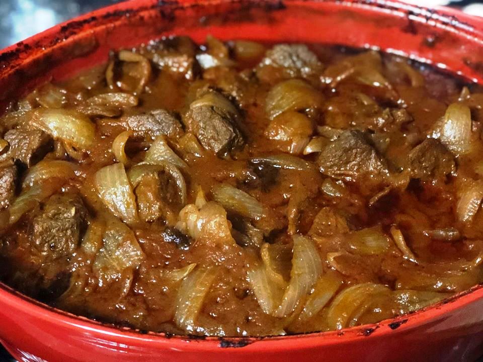 – After 2 hours, stir in wine and sliced onions, transfer to a ceramic baking dish, cover and bake in a preheated, 375° F (190°C) oven for 1 hour. Stir 2 or 3 times for that hour.