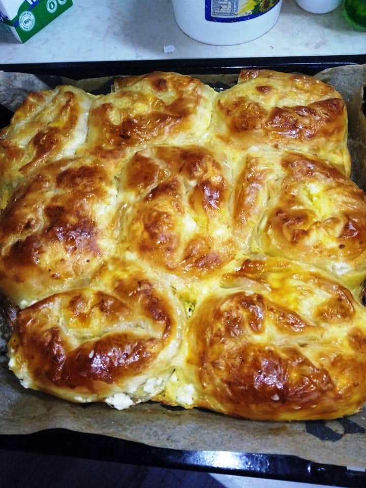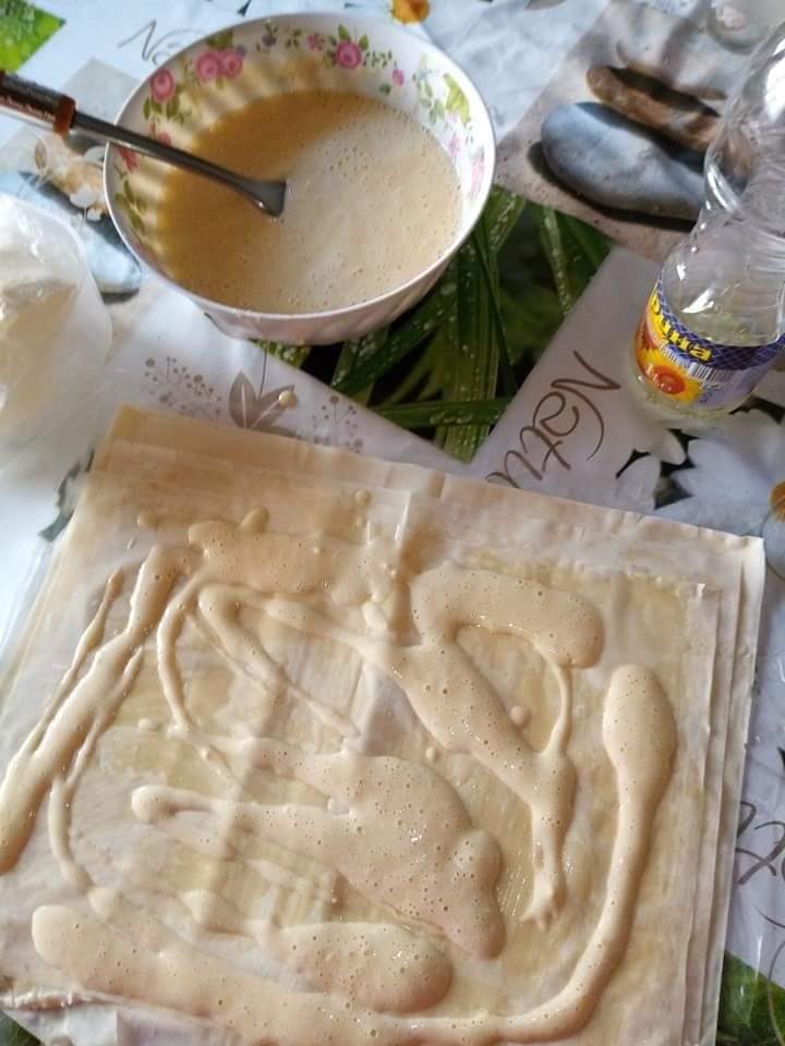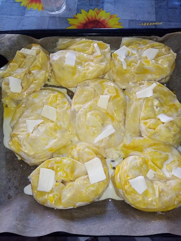 Κάνω το ίδιο και με τις υπόλοιπες κρούστες. Τέλος αλείφω με κρόκο αυγού βάζω ένα κομματάκι βουτυρο και πασπαλίζω με γάλα.