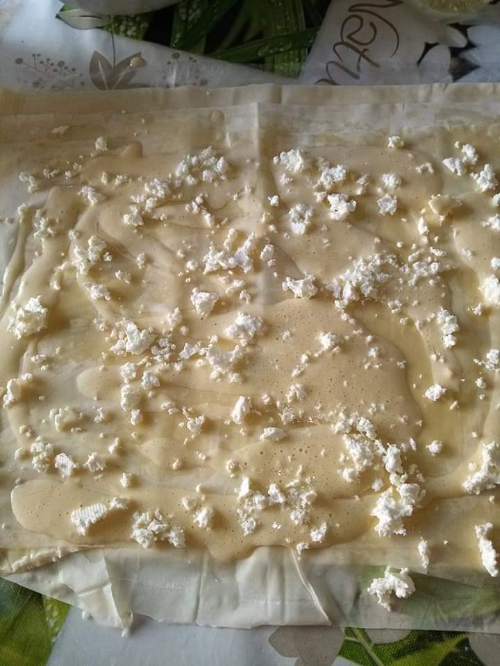 Παίρνω το πρώτο φύλλο αλειφω με λάδι με ένα πινέλο, μετά βάζω ένα δεύτερο αλείφω με λάδι (μπορείτε να βάλετε και 3ο φύλλο) και βάζω τη γέμιση και πασπαλίζω με τριμμένο τυρί
