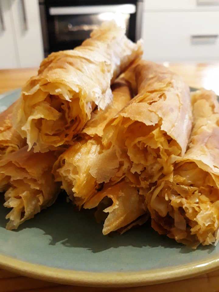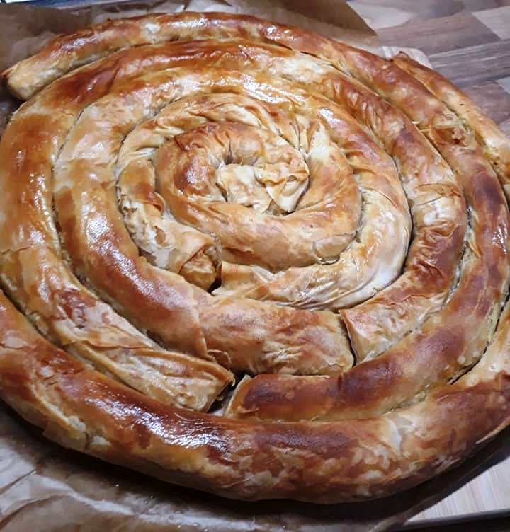 • Κάντε ένα χαλαρό ρολό και τακτοποιήστε σε ένα λαδωμένο τηγάνι σε κύκλο (σαλιγκάρι).