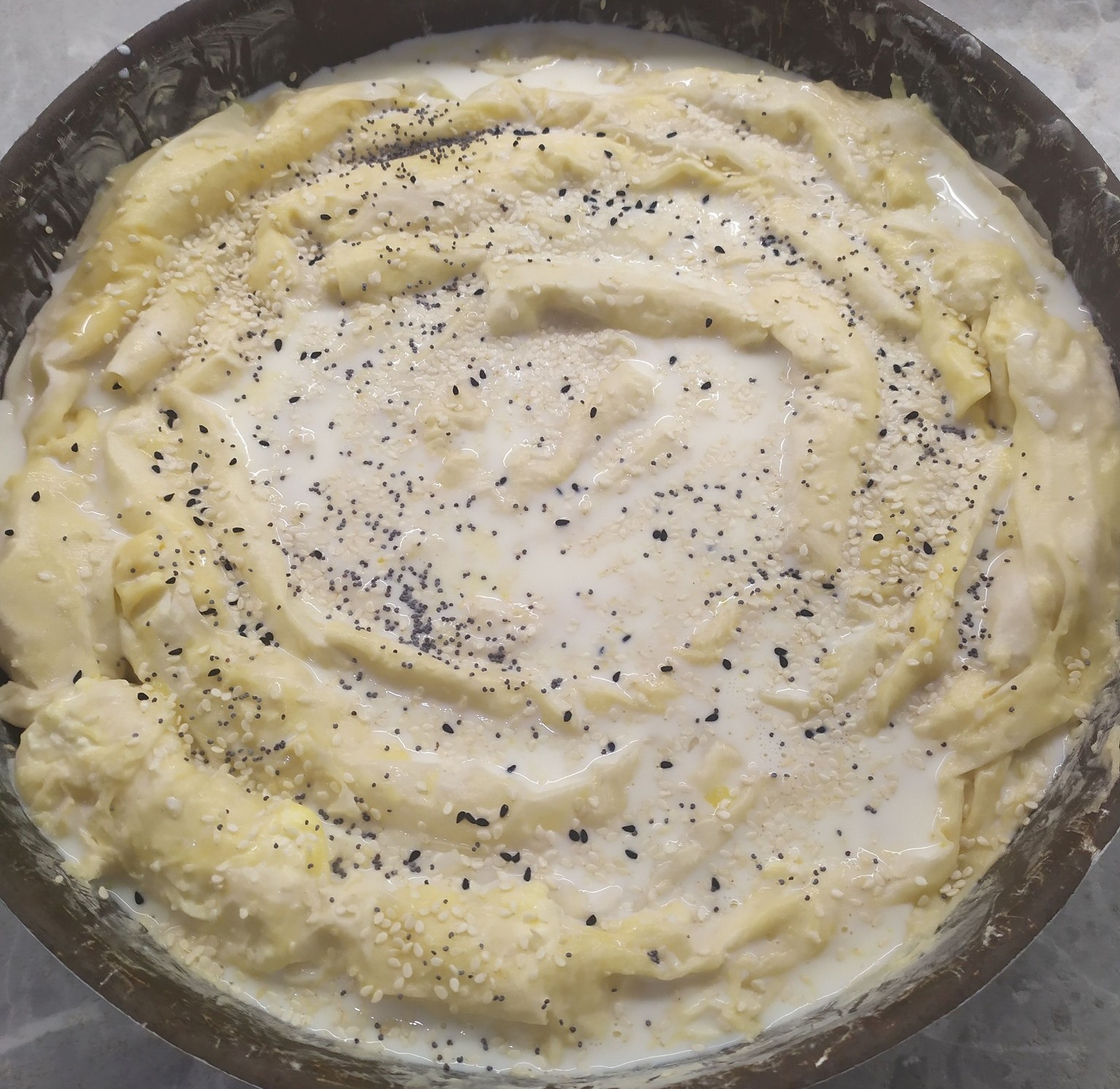 - Ψήστε την πίτα σε προθερμασμένο φούρνο στους 180°C στις αντιστάσεις για 55 λεπτά. (Σημειώνεται ότι η αρχική συνταγή ανέφερε ψήσιμο στον αέρα στους 190°C για περίπου 35 λεπτά, αλλά η προσαρμογή έγινε για τις αντιστάσεις). Πριν το ψήσιμο, μπορείτε, αν χρειαστεί να φύγετε, να βάλετε την πίτα στο ψυγείο για περίπου μία ώρα, όπως συνέβη και στην περίπτωση αυτή.