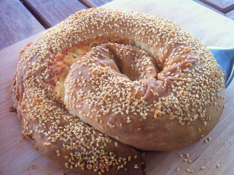Τοποθετήστε τη ζύμη σε μια μεγάλη, και απλώστε τη μισή γέμιση. Θα μπορούσατε να χρησιμοποιήσετε όποιο τυρί σας αρέσει. Προσθέστε μερικά κομμάτια βούτυρο για επιπλέον γεύση. Γυρίστε το φύλλο τυλίγοντας σχηματίζοντας ένα σαλιγκάρι και στη συνέχεια τοποθετήστε το σε ένα ταψί. Βουτυρώστε με λίγο λιωμένο βούτυρο και πασπαλίζουμε σουσάμι. Επαναλάβετε με τη δεύτερη μπάλα ζύμης.
