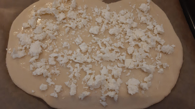 Αλείφουμε το φύλλο με ένα μέρος απο το λιωμένου βουτύρου με λάδι (θα μπορούσε να είναι βούτυρο, αλλά δεν το είχα) και ένα μέρος του τεμαχισμένου τυριού.