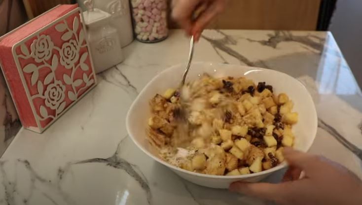 Τα βάζουμε σ ένα μπολ και ρίχνουμε τα μπισκότα, τις σταφίδες, τα καρύδια ,τη ζάχαρη,