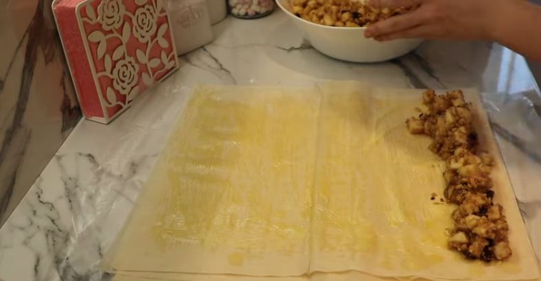 Παίρνουμε 3 φύλλα τα αλείφουμε ένα ένα με λιωμένο βούτυρο και προσθέτουμε στην άκρη