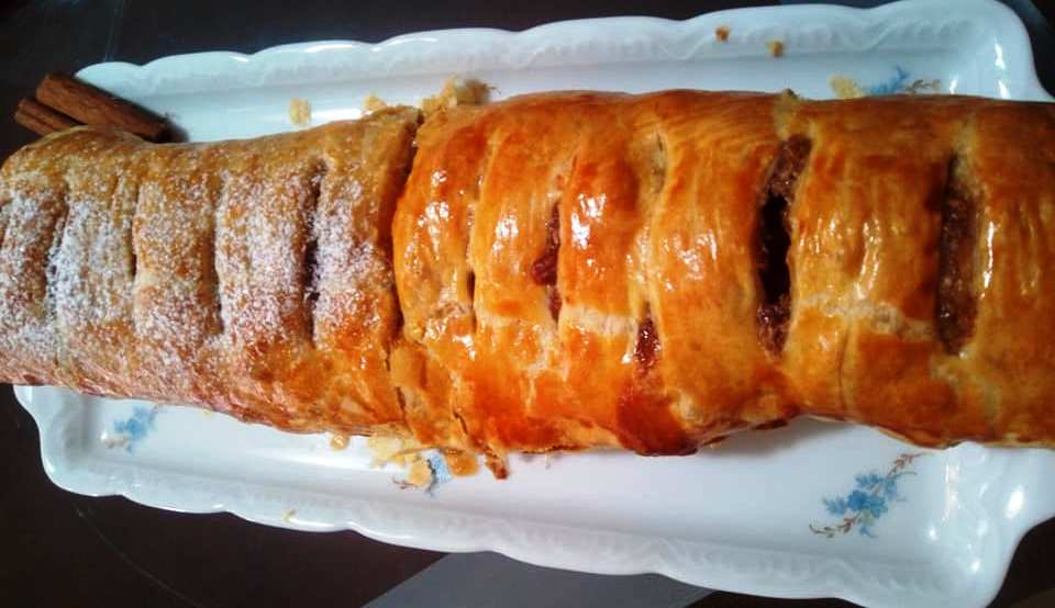 Απλώνουμε το φύλλο σφολιάτας βάζουμε πρώτα το μείγμα καρυδιού και από πάνω τα μήλα. Ρολάρουμε, κλείνουμε καλά τις άκρες. Επαναλάβετε το ίδιο με το δεύτερο φύλλο. Χαράζουμε και αλείφουμε με αυγό αναμεμειγμένο με λίγο νερό. Ψήνουμε σε αέρα στους 190 για 40, 45 λεπτά. Αν θέλουμε βάζουμε και σταφίδες . Γίνονται δύο στρούντελ. Καλή επιτυχία.😋
