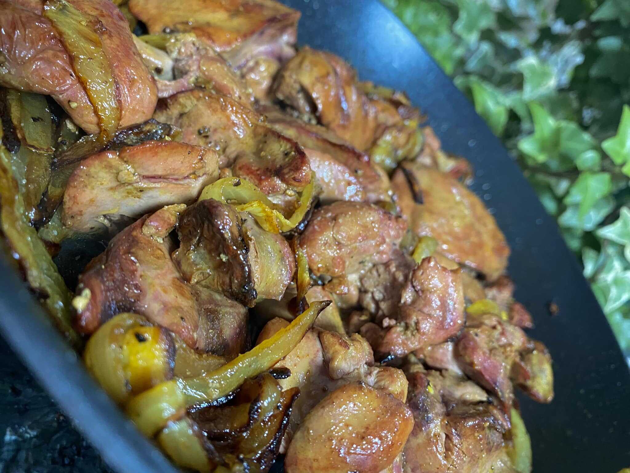 Βγάζουμε τα συκωτάκια κοτόπουλου από το τηγάνι και τα βάζουμε πάνω από τα κρεμμύδια και τις πιπεριες.
