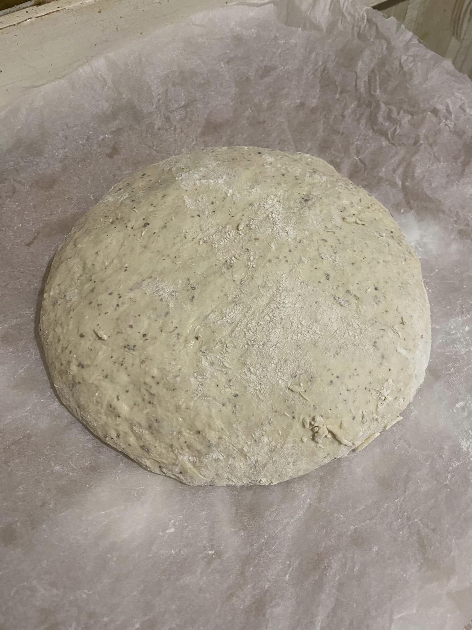Ανακατεύουμε με ένα κουτάλι και αφήνουμε για 40 λεπτά πασπαλίζουμε με αλεύρι και πλάθουμε το ψωμί και το βάζουμε σε λαδόκολλα, το αφήνουμε να φουσκώσει για 10 λεπτά.