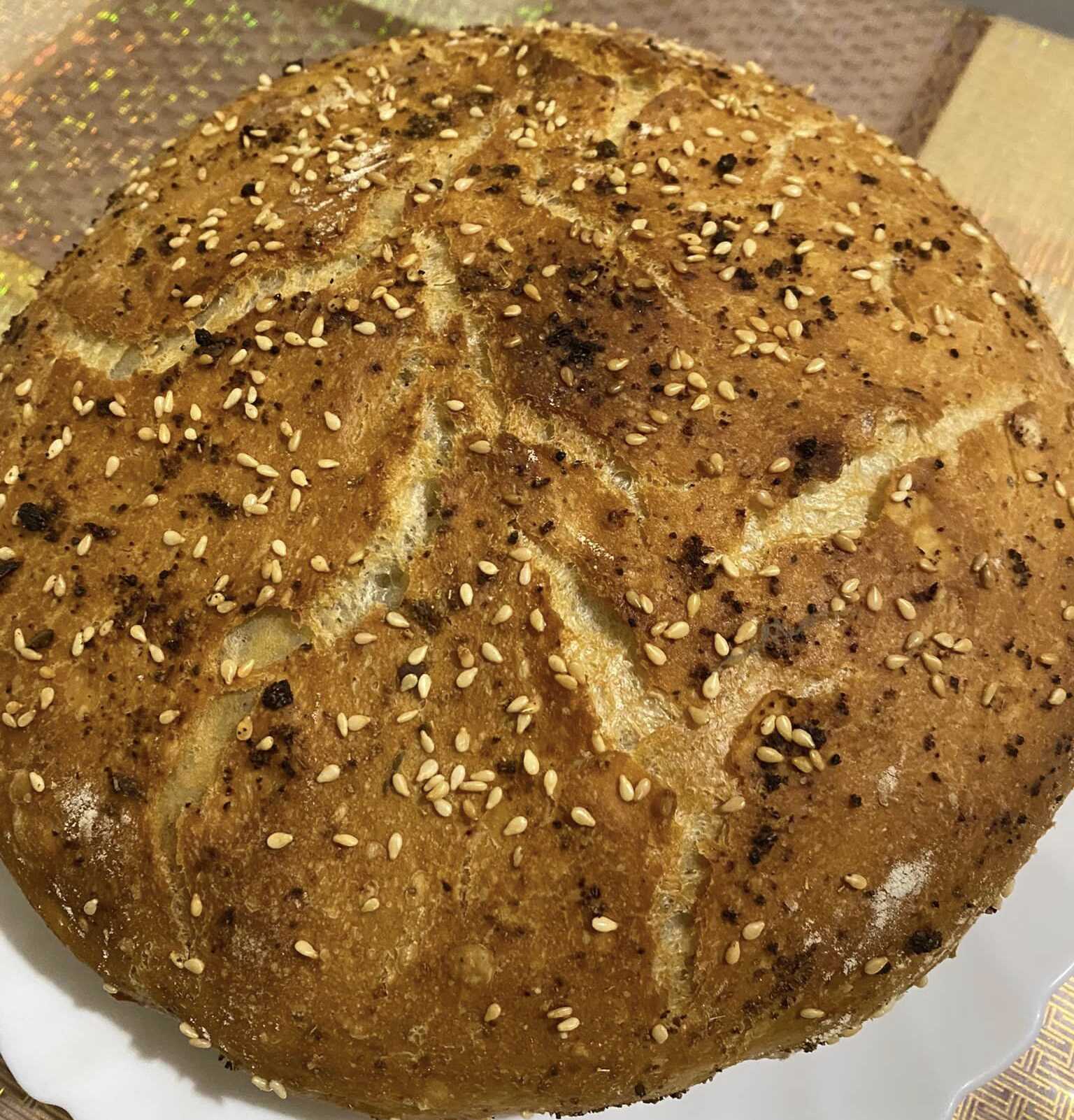 Στο διάστημα αυτό ζεσταίνουμε τον φούρνο με μια κατσαρολα για φουρνο στους 250 βαθμούς, αλείφουμε το ψωμί με λάδι και πασπαλίζουμε με χοντρό αλάτι με τα καρυκεύματα ή σουσάμι της γεύσης σας,