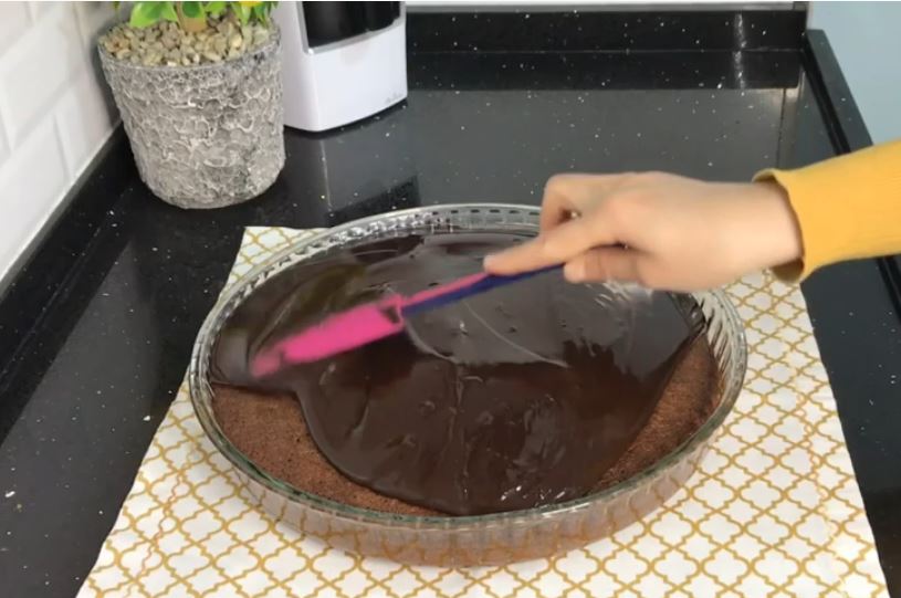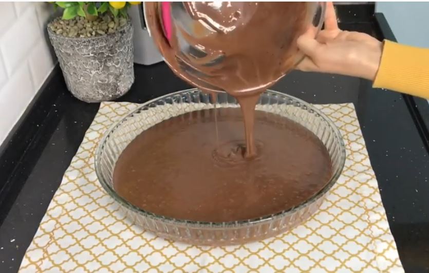 Αφήνουμε λίγο να κρυώσει, αλλά προσέχουμε όταν περιχύσουμε το γλυκό να μην έχει προλάβει να πήξει η σοκολάτα.