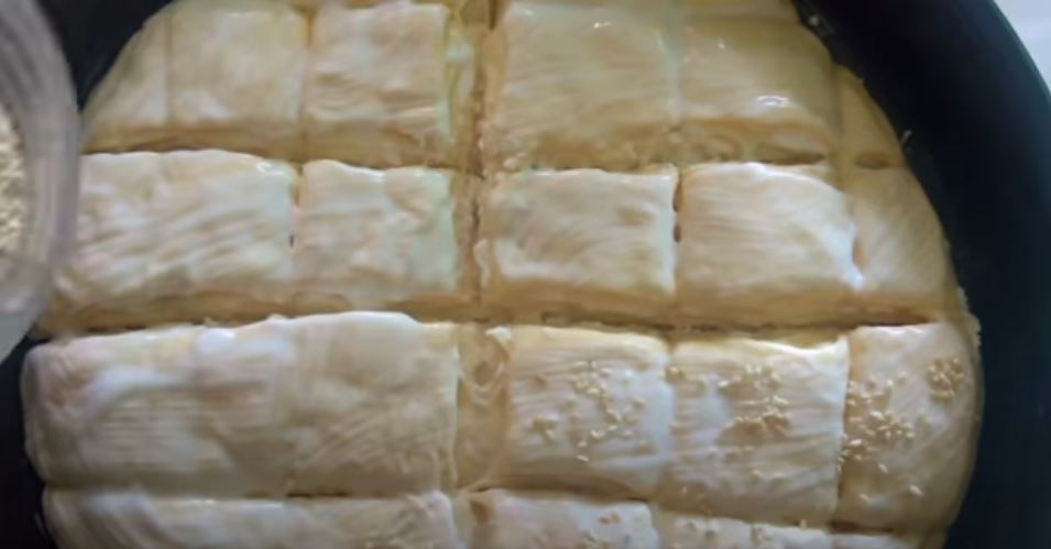 Μετα τα 15 λεπτά αλείφουμε με γιαούρτι και πασπαλίζουμε με σουσάμι.