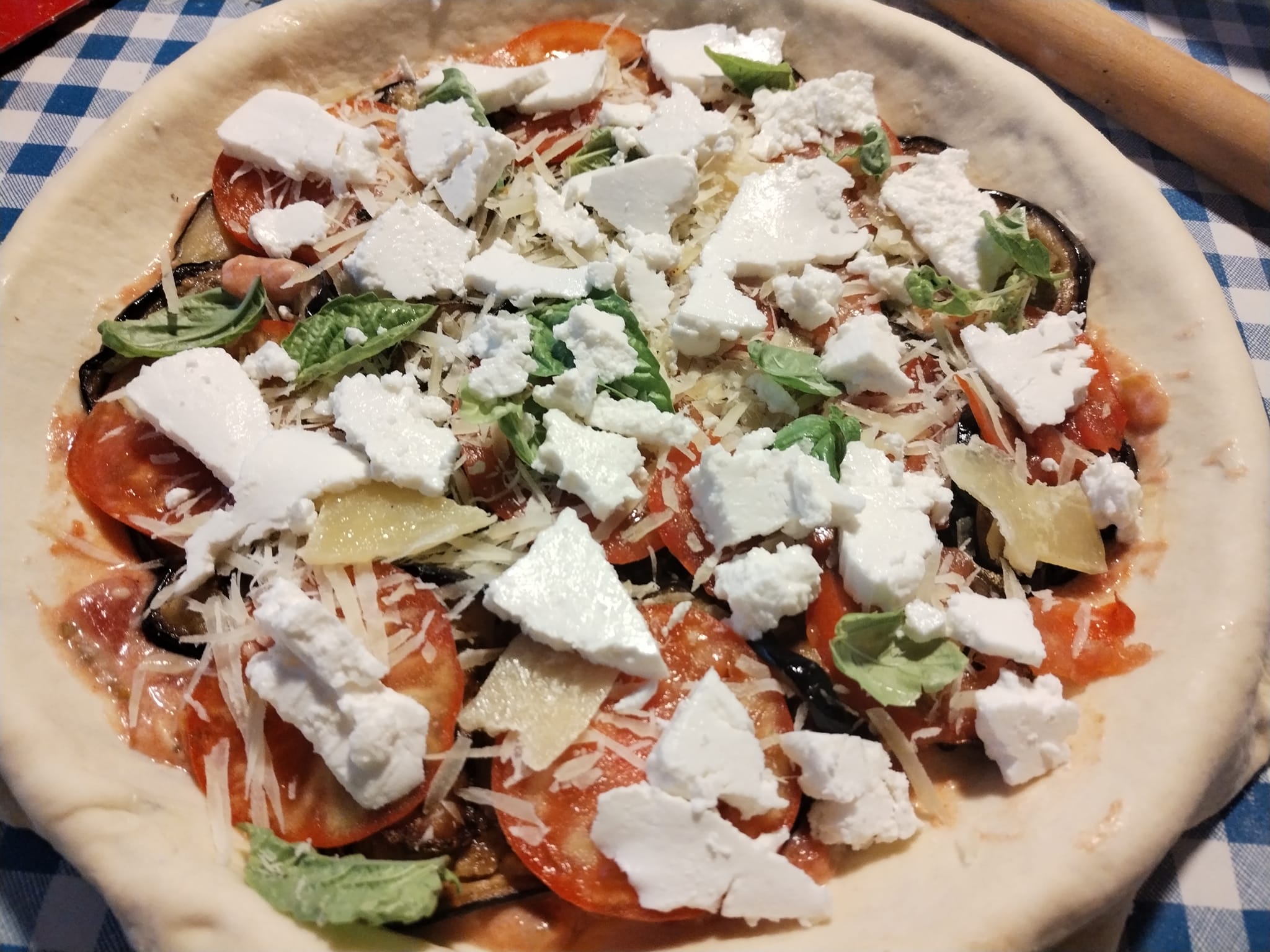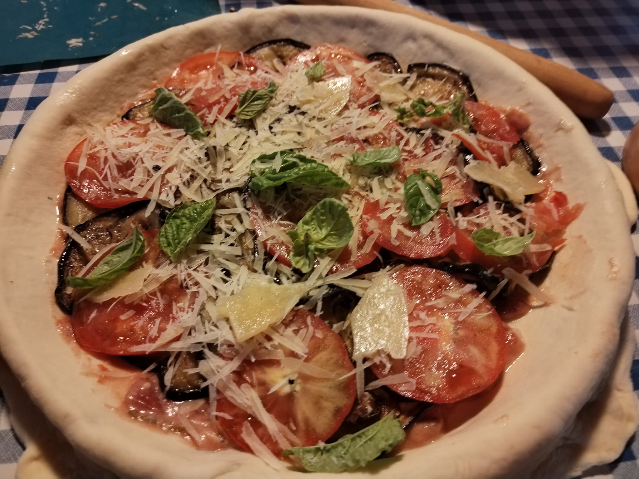 Απλώνουμε το φύλλο σφολιάτας σε ένα ταψί. Απλώνουμε ένα στρώμα σάλτσας ντομάτας πάνω στη σφολιάτα. Προσθέτουμε ένα στρώμα μελιτζάνας, στη συνέχεια ρικότα, πεκορίνο και φέτες ντομάτας.