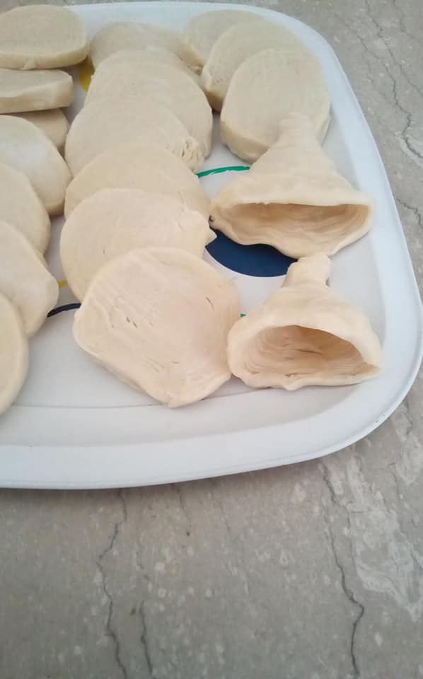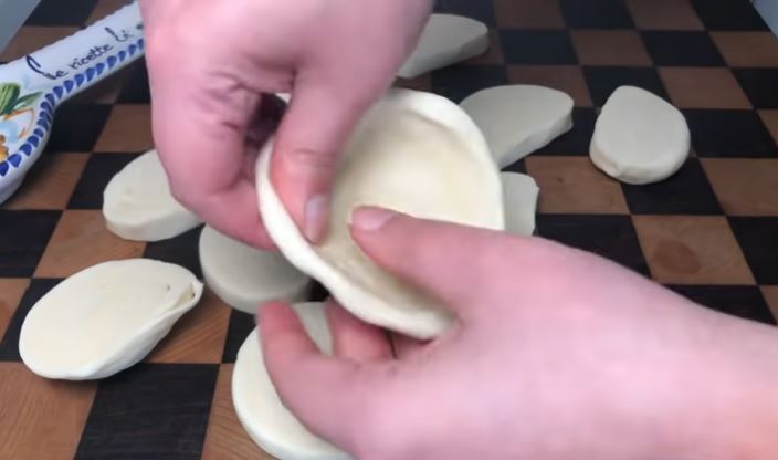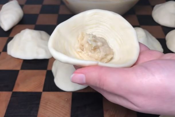 Πάρτε κάθε φέτα, και πιέστε προς τα έξω για να σχηματιστεί ένα χωνί. Γεμίζουμε με τη γέμιση και κλείνουμε σφραγίζοντας τις άκρες.