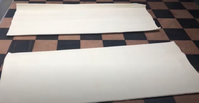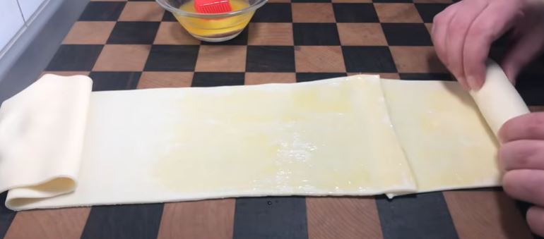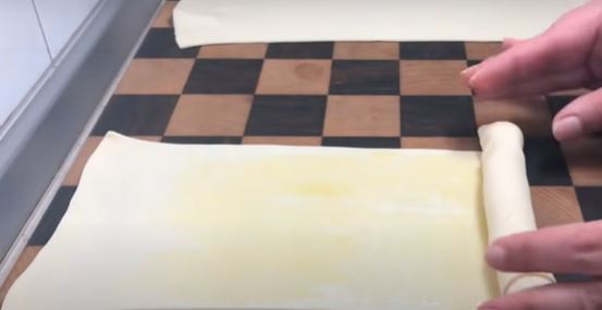 Ας ξεκινήσουμε με τη σφολιάτα. Παίρνουμε τα δύο ρολά και τα ανοίγουμε. Τα κόβουμε στα δύο και εν τω μεταξύ λιώνουμε το βούτυρο σε φούρνο μικροκυμάτων. Με τη βοήθεια ενός πλάστη, ανοιξτε τη σφολιάτα σε ποιο λεπτή και αρχίστε να αλείφετε την πρώτη