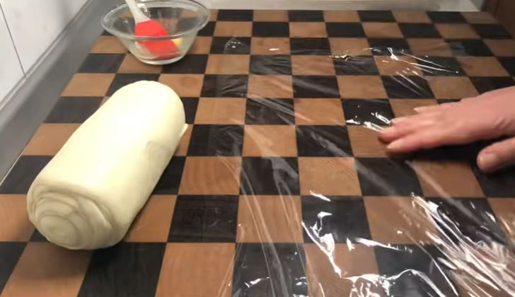 ένα ωραίο σφιχτό ρολό. Το τυλίγουμε με μεμβράνη και το βάζουμε στο ψυγείο όλο το βράδυ να σφίξει.