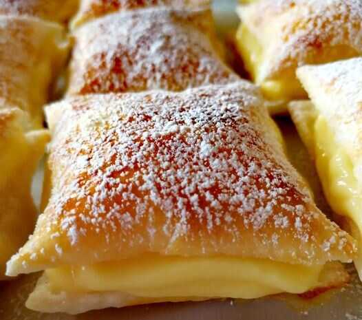 Βγάζετε την κρέμα ζαχαροπλαστικής από το ψυγείο, τη βάζετε σε σακούλα ζαχαροπλαστικής ή με ένα κουτάλι γεμίζετε 12 τετράγωνα και στη συνέχεια προσθέτετε τα υπόλοιπα τετράγωνα, πασπαλίζετε με ζάχαρη άχνη και σερβίρετε. Αν θέλετε να τα φάτε ζεστά, προθερμάνετε το φούρνο στους 180° και ζεστάνετε για περίπου 2-4 λεπτά.