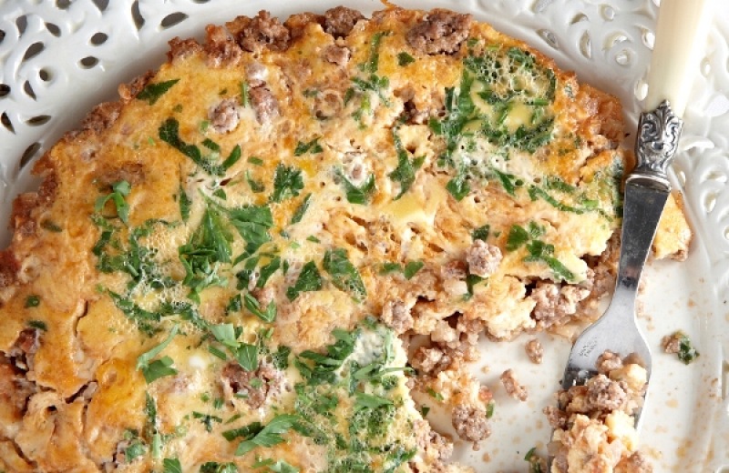 Σ’ ένα βαθύ πιάτο χτυπάς τα αυγά με τον μαϊντανό για λίγα δευτερόλεπτα. Αλατίζεις, προσθέτεις 2 κουταλιές της σούπας νερό, βγάζεις την κανέλα και ρίχνεις τα αυγά στον κιμά.