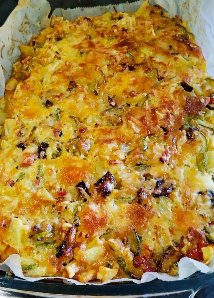 Μόλις ψηθούν τα λαχανικά, τα ανακατεύετε όλα μαζί με τυρί και τα βάζετε σε ένα πυρέξ. Σε ένα ξεχωριστό μπολ, χτυπάτε αυγά, γάλα, αλάτι και πιπέρι, ενώ έχετε διαλύσει μέσα και μπέικιν πάουντερ. Χτυπάτε το μείγμα πολύ καλά και το ρίχνετε πάνω από τα λαχανικά.