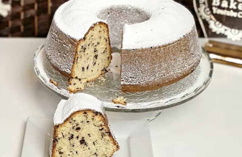 8. Όταν πλέον έχει ψηθεί το κέικ, το αφήνω να κρυώσει λίγο, το αναποδογυρίζω σε μια πιατέλα και το διακοσμώ με ζάχαρη άχνη.