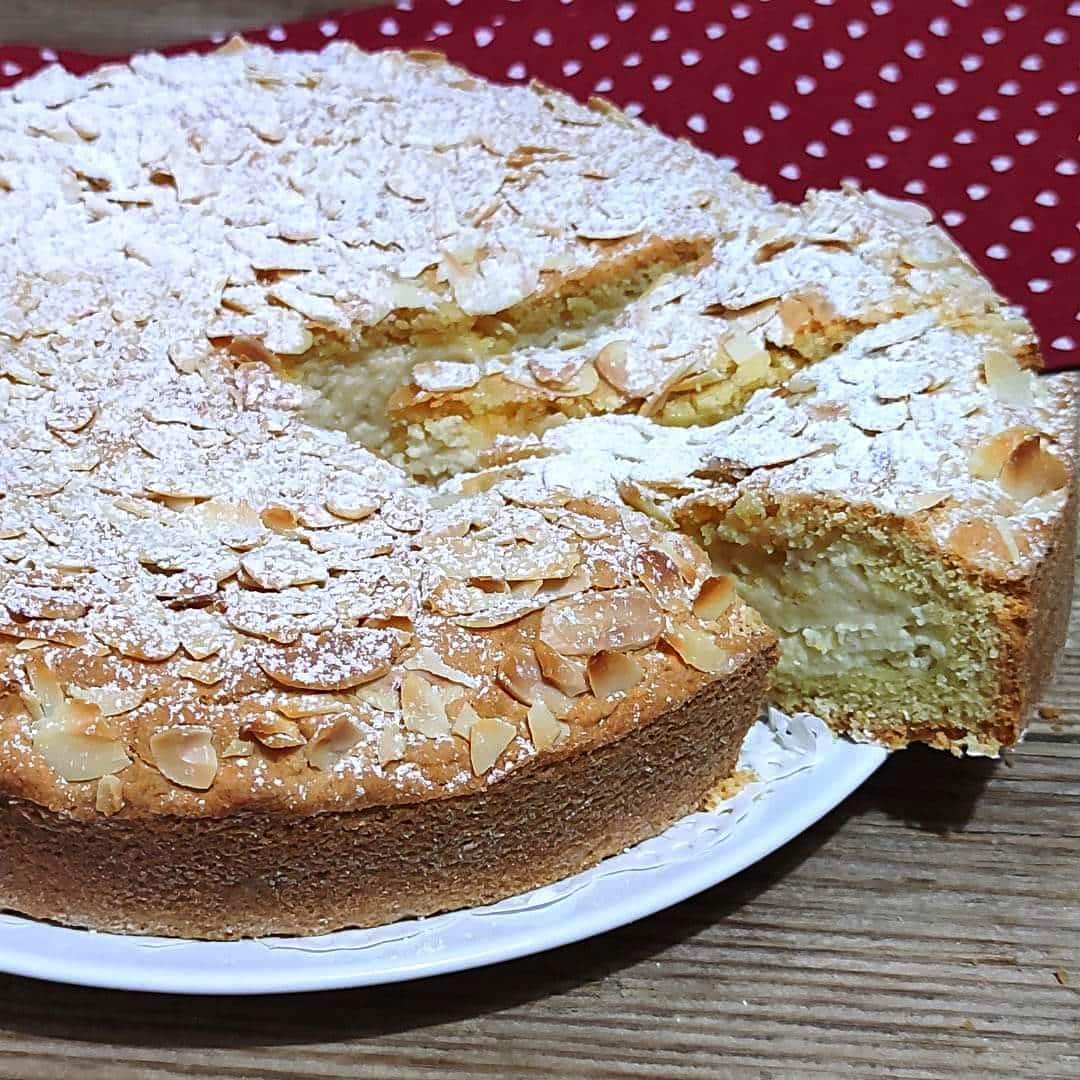 Γεμίστε τη βάση ζαχαροπλαστικής με την κρέμα ricotta, ξεδιπλώστε το υπόλοιπο ζαχαροπλαστικής και καλύψτε την τάρτα. Τακτοποιήστε τα κομμένα αμύγδαλα σε ολόκληρη την επιφάνεια της τάρτας.