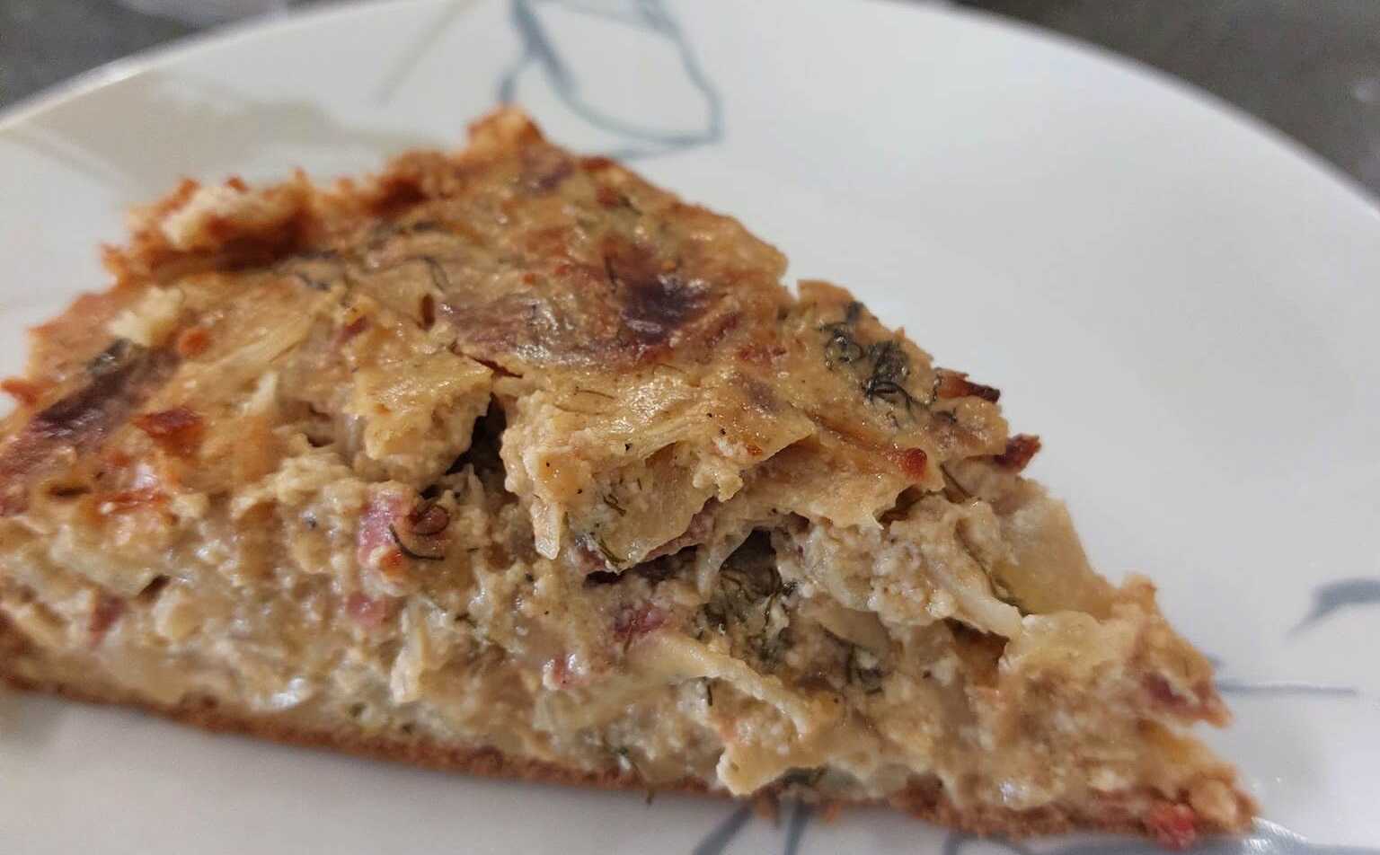 Το ζυμαράκι έχει φουσκώσει. Το πλάθουμε με τον πλάστη στο μέγεθος του ταψιού. Απλώνουμε στα λαδωμένο και αλευρωμένο ταψί μέχρι και τα πλαϊνά. Προσθέτουμε το μείγμα κρεμμύδια και ψήνουμε σε καλά προθερμασμένο φούρνο στον αέρα στους 180’C βαθμούς για 40′ λεπτά.
