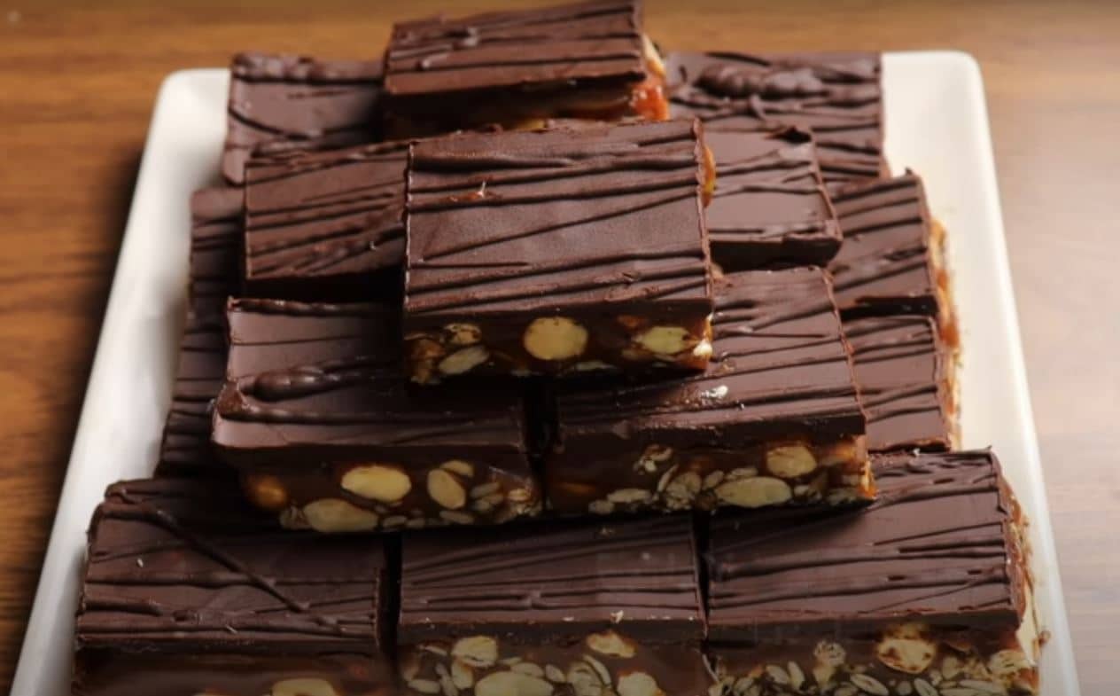 Λιώνουμε τη σοκολάτα σε μπεν μαρί και την απλώνουμε πάνω απ τους ξηρούς καρπούς. Κρατάμε 2-3 κουταλιές για αργότερα. Βάζουμε στο ψυγείο μέχρι να παγώσει.
