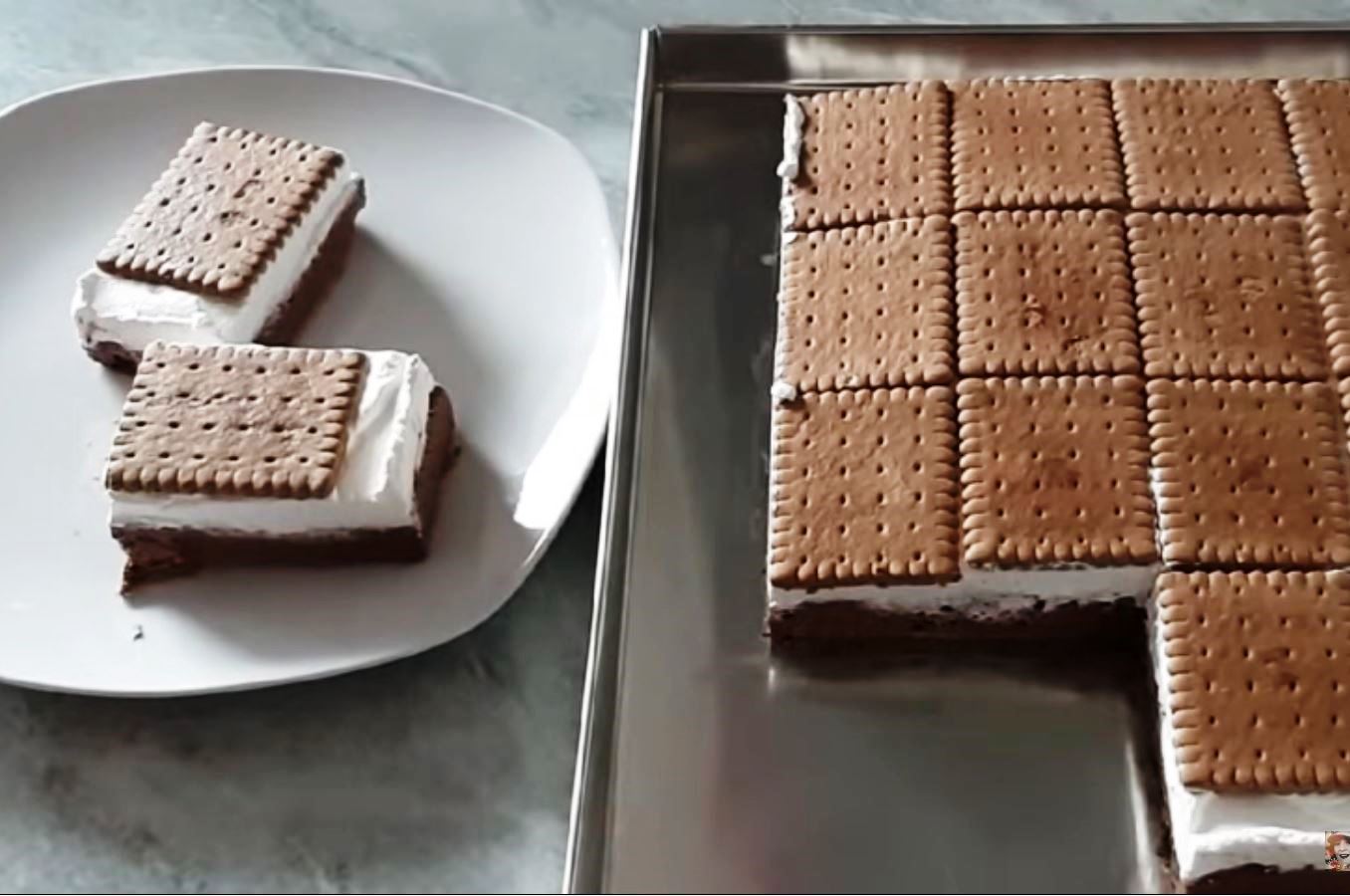 Χτυπάμε την κρύα κρέμα γάλακτος με ένα μίξερ χειρός και απλώνουμε την σαντιγί πάνω από την κρέμα σοκολάτας. Στρώνουμε μία τελευταία στρώση μπισκότων αφού πρώτα τα βουτάμε στο γάλα και βάζουμε στο ψυγείο για 2-3 ώρες. Βγάζουμε από το ψυγείο κόβουμε και σερβίρουμε.