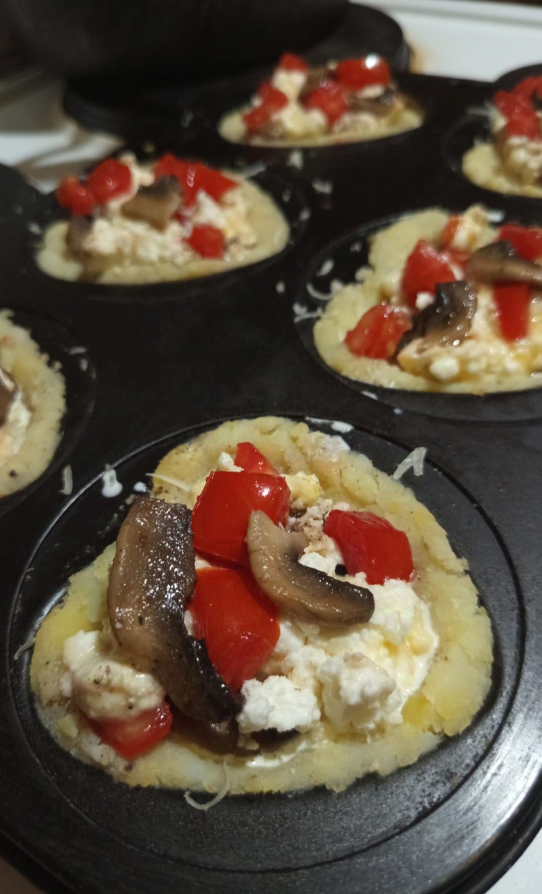 Από πάνω κασέρι τριμμένο,1 κ.σ.κρ.γαλακτος σε κάθε θήκη, φέτα σπασμένη στο χέρι, μανιτάρια φρέσκα, χοντροκομμένα και σοταρισμενα,ντομάτα κομμενη σε κυβακια.