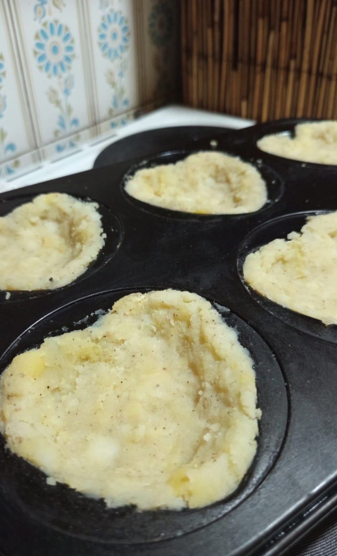 Βουτυρωσα μια φόρμα με 6 θήκες και έβαλα στον πάτο τους και στα τοιχώματα το μείγμα.