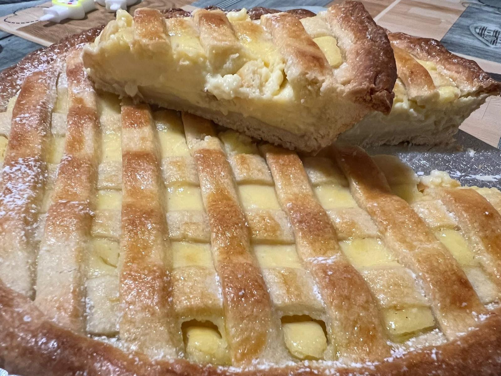 Ρίξτε την κρέμα απο πάνω, την υπόλοιπη ζύμη και κόψτε σε λεπτές λωρίδες. Τοποθετήστε τις λωρίδες στη ζύμη σχηματίζοντας ένα πυκνό πλέγμα.