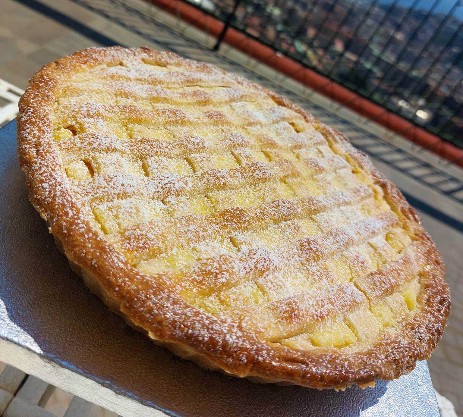 Ρίξτε την κρέμα απο πάνω, την υπόλοιπη ζύμη και κόψτε σε λεπτές λωρίδες. Τοποθετήστε τις λωρίδες στη ζύμη σχηματίζοντας ένα πυκνό πλέγμα.